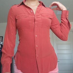 Gorgeous rust colored button down shirt by Bebe. Size XXS, 100% mulberry silk. Features front pockets and button details on shoulders. Perfect for casual or office wear. Beautiful and flowy, with side slits and a slight high low cut. Very flattering shape as shown in photos. Minor flaws (discoloration) pictured, price reflects.