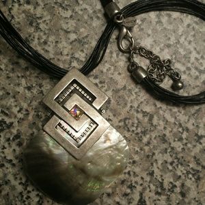 This bulky necklace is perfect for the summer. With multistrand black cord and geometric workings it will work well with a variety of outfits!