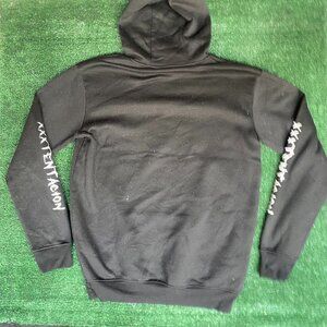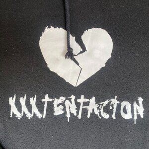 Black long sleeve hoodie sweatshirt with white XXXTentacion broken heart spell out logo graphic. Regular fit. Essential emo rap merch hoodie.