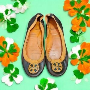 Step out in elegance with these Tory Burch ballet flats, a harmonious blend of fashion and comfort. The size 7.5 shoes showcase a chic brown palette, accented by subtle orange highlights, embodying a sophisticated yet playful aesthetic that's perfect for any occasion. Crafted from premium leather, these flats promise durability and luxurious feel. They're designed with a versatile style that pairs effortlessly with both casual and formal attire, making them an essential addition to any woman's wardrobe who appreciates impeccable taste and quality.