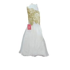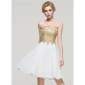 This is a knee-length A-line homecoming dress from JJ's House in size US 8/EU 38. The dress is strapless and made of chiffon fabric, with a lined interior. It is designed for women and falls under the brand "House."