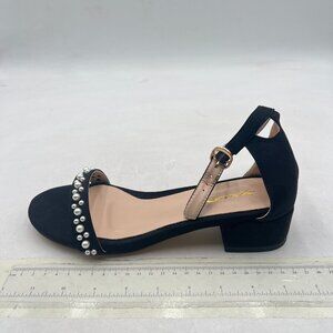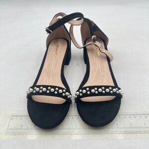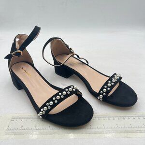 XYD Black Pearls Open Toe Strappy Low Block Heel Ankle Strap with Buckle Sandal