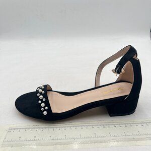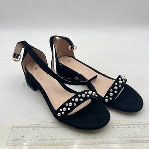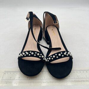 XYD Black Pearls Open Toe Strappy Low Block Heel Sandal Ankle Strap with Buckle