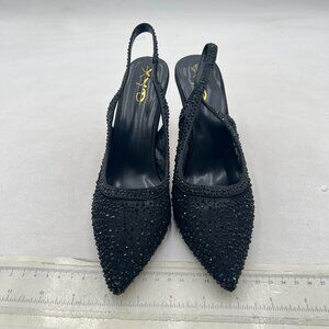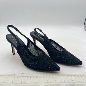 XYD Black Slingback High Heels Dazzled Rhinestones Studs Mesh Pointed Toe Pumps