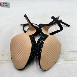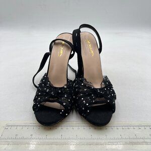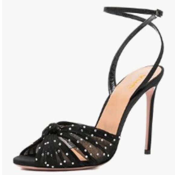 XYD Black Stiletto High Heel Ankle Strap Crystal Studs Sheer Mesh Knotted Sandal