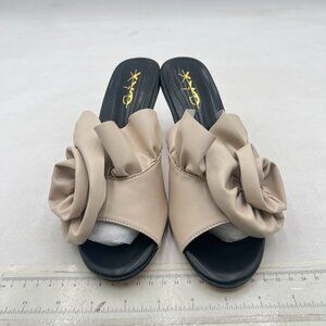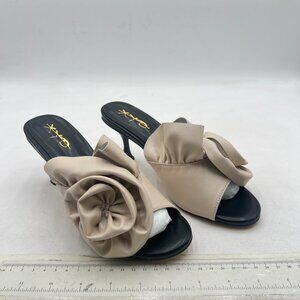 XYD Black White Floral Appliqué Open Toe Mules Ruffled Mid Heel Sandals Summer