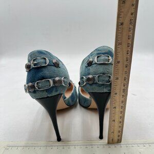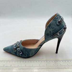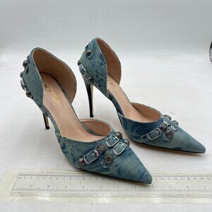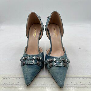 XYD Blue Denim High Heels Slip On Pointed Toe Textured Studs Buckle D'Orsay Pump