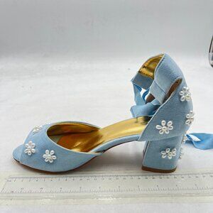 XYD Blue Open Toe Sandals with Bloom Pearl Flower Ribbon Ankle Strap Chunky Block Heel Wedding Bridal Shoes