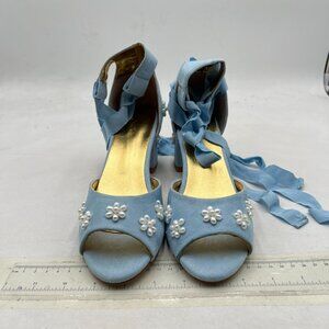 XYD Blue Open Toe with Bloom Pearl Flower Ribbon Ankle Strap Chunky Heel Sandals