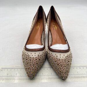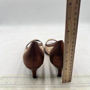 XYD Brown Pointed Toe Slip On Mesh Pumps Rhinestone Studs Comfy Kitten Heel Shoe