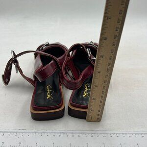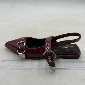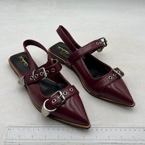 Elegant burgundy slingback heels. Features silver buckle accents. Perfect for stylish outings.