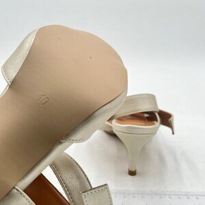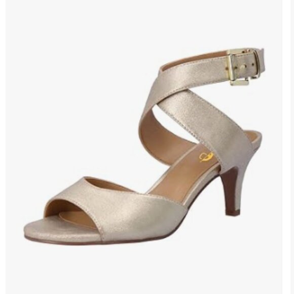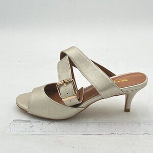 Elegant gold sandals with a strappy design. Features a chic buckle closure. Perfect for any occasion.