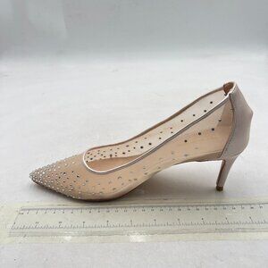XYD Light Pink Low Heels Pumps Sheer Mesh Crystal Studs Pointed Toe Sexy Shoes