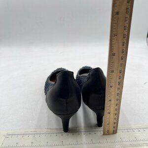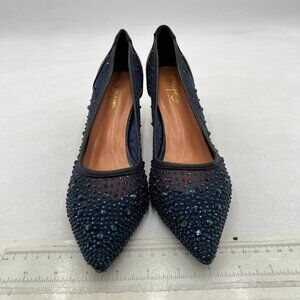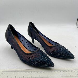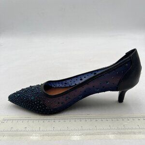 XYD Navy Pointed Toe Slip On Mesh Pumps Rhinestone Studs Comfy Kitten Heels Shoe