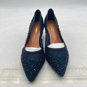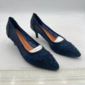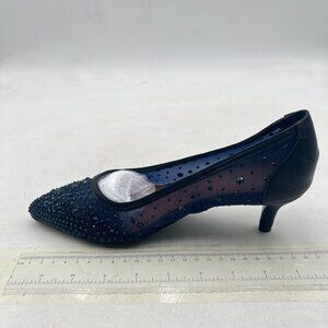 XYD Navy Pointed Toe Slip On Mesh Pumps Rhinestone Studs Kitten Heels Shoes