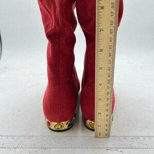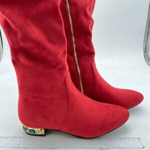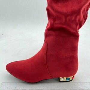 XYD Red Knee High Boot Rhinestone Side Zip Up Almond Toe Wide Calf Shoes
