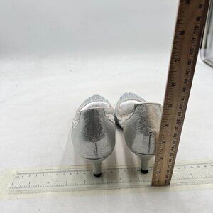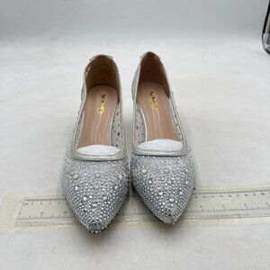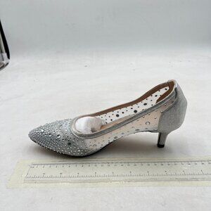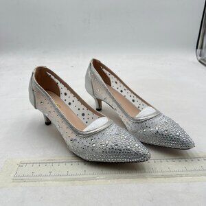 XYD Silver Pointed Toe Slip On Mesh Pumps Rhinestone Studs Kitten Heels Shoes