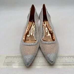 XYD Silver Pointed Toe Slip On Mesh Pumps Rhinestone Studs Kitten Heels Shoes