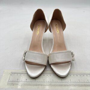 XYD White D' Orsay Low Heel with Cute Buttons Open Toe Satin Slip On Dress Shoes