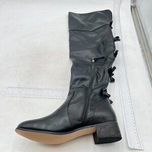 XYD Women Over The Knee Thigh High Leather Riding Boots Chunky Heel Round Toe Cute Rear Bowknots Stretchy Zipper Flat Booties Shoes