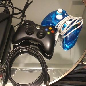 Pre-owned. 2 controllers, the black one of which is wireless, the adapter/power cable, and HDMI cable