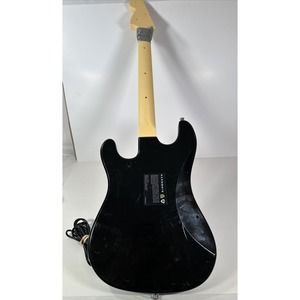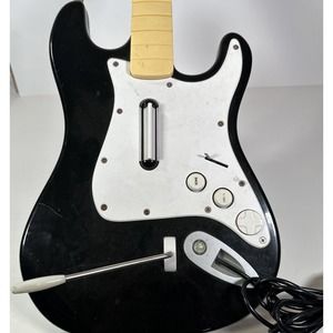 Up for sale is a Harmonix Fender Stratocaster Wired Guitar for the Xbox 360 gaming platform. This guitar is designed for use with the popular game, Rock Band, and is compatible with Microsoft Xbox 360 consoles. It features a sleek black color and is made of durable plastic material.