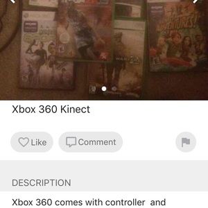 Comes with games shown Kinect and one controller works great I just don't use it anymore because I have an Xbox 1