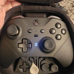 Comes with hard case and interchange buttons. Really nice controller. Been stored. One photo has lights on, so you can see it works. No charging cord included. It takes C charger.