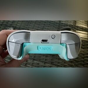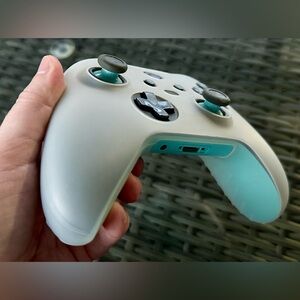 Used with visible signs of some wear of a Xbox One wireless controller in the colors light blue and grey and will come with a clear silicone case as shown in the pictures.