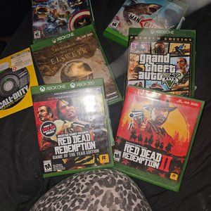 GTA 5, RED DEAD REDEMTION GAME OF THE YEAR EDITION PLUS ZOMBIE MODE, RED DEAD REDEMPTION 2, LEGO THE AVENGERS UNOPENED, CALL OF DUTY INFINITE WARFARE, MANEATER, THE ELDER SCROLLS ELSWEYR