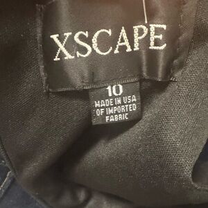 This stunning Xscape gown features a sleek black halter neckline and a sleeveless design, perfect for prom or cocktail events.