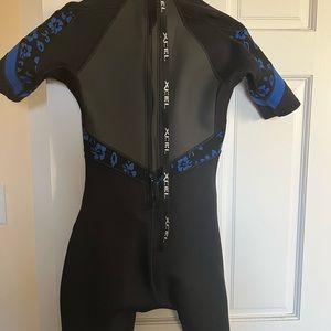 Xcel Performance “shortie” wetsuit. Sleeves hit above the elbow and legs hit above the knee. Wide, heavy-duty zipper with long string to aid in putting it on and taking it off. Velcro enclosure around zipper and secure neckline. Neoprene. Size M.