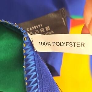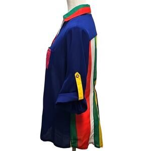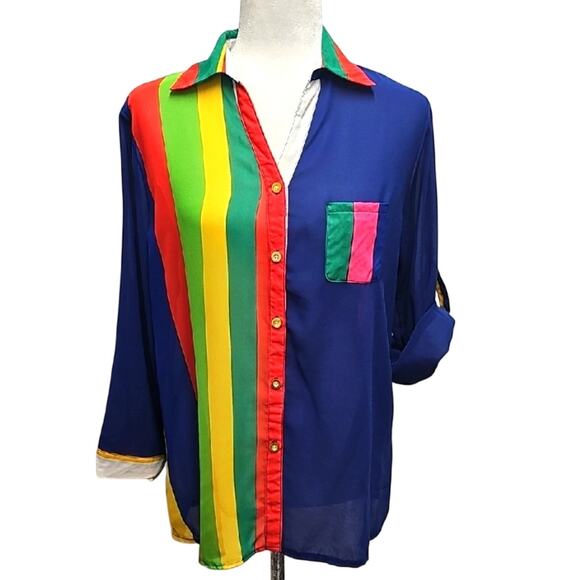 Vibrant semi-sheer button-up shirt with multicolor stripes. Features red, green, yellow, and blue stripes. Perfect for a bold look. The sleeves can be worn up or down. Gathering in back and high low hem gives this top a chic and modern design.