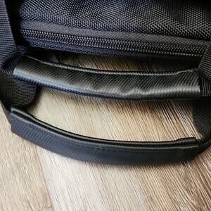 Multiple compartments. 2 different carrying straps. Strap on back to attach to your rolling luggage handle. Like brand new!