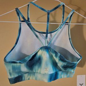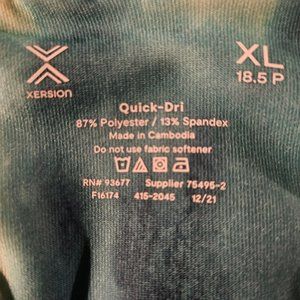 Xersion Athletic Top. Quick dry 87% Polyester, 13% Spandex. XL though seems to run a bit small. Feels like swimsuit material. No cups. Teal. Like new with tags