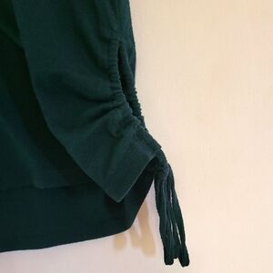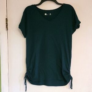This Xersion top features a vibrant green hue and a stylish ruched design, perfect for casual wear. The cuffed short sleeves and relaxed fit offer comfort and versatility, making it an ideal choice for everyday outfits. No rips, tears or stains. Smoke and Pet free home.