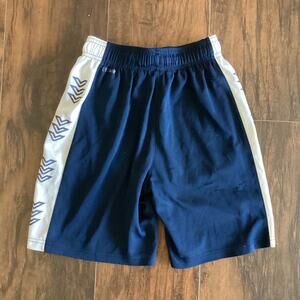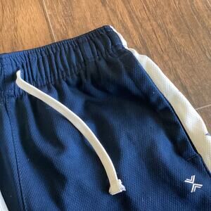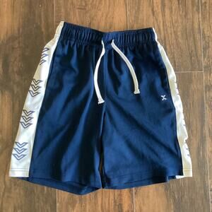 Navy blue long gym shorts by Xersion in good preowned condition. There are several pulled strings on the back from use. No other flaws. Feature Everair technology.