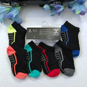New with Detached Packaging 6 Pairs of Socks for Boys Size S (5-6.5). As per tag "Performance low cut, moisture management, reinforced heel & toe, arch support". The cardboard is detached from the socks, but I will ship it out with the ziploc bag to keep it all together. Pictures are part of description.