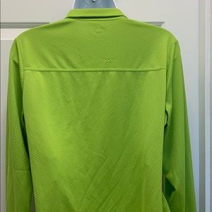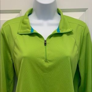 A lime green, light weight, pullover! Zipper in front. Holes in sleeves for thumbs! One small snag in the back.