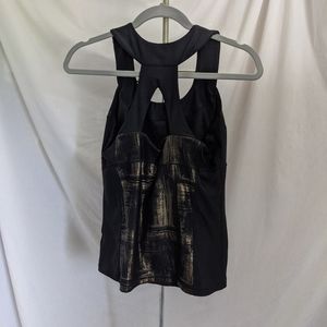Only ever tried on. Has a built-in sports bra and is black with gold brush strokes in the center to give it a color block look.
