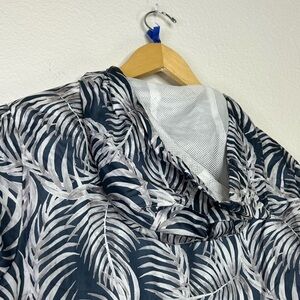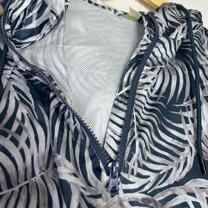 A light weight hooded half zip rain jacket. Large front pocket, pull strings on the hood and a mesh lining through some of it. Elastic at the sleeve ends.