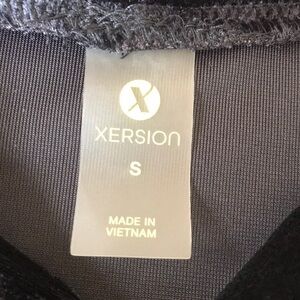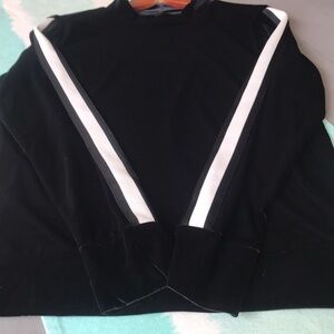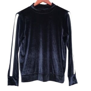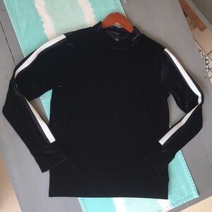 Xersion, velour/velvet, athletic style, top. Mock neck, long sleeve pullover. Soft & stretchy 92% polyester 8% spandex. Black with white stripes down the sleeves.
