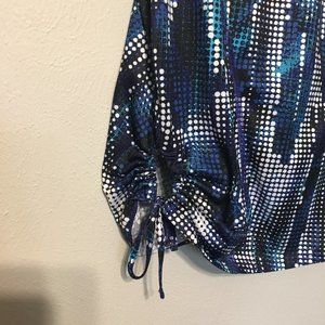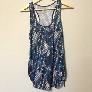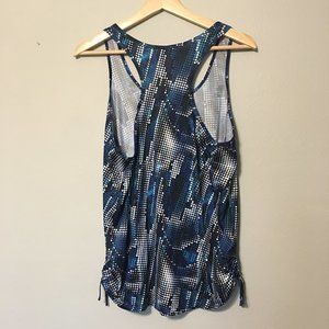 Xersion Racerback Workout Tank, Size Large, Like New. 100% polyester, quick dry material. Blue and white geometric print with 6" side slits with ties that allow you to ruche up the sides.