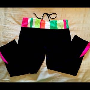 Size Small Xersion athletic Capri leggings. Black with bright neon colours on waist, pink on the bottoms. Has a adjustable tie inside waist band. Worn once or twice!