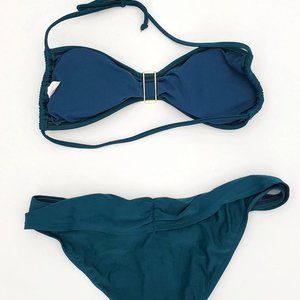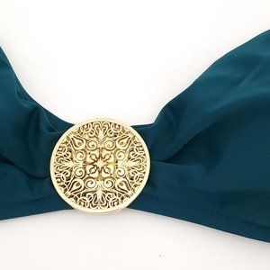 This is a Xhilaration bandeau style bikini set featuring a stunning turquoise color and gold accent.
