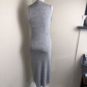 This gray ribbed dress from Wilfred Free is a must-have for any casual summer occasion. The sleeveless tank style dress features a crew neckline and a pullover closure. It is made of stretch material that provides comfort and flexibility, making it a great choice for any season. The dress has a mid-calf length and comes in size small. The solid pattern, stylish stretch design, and comfortable fit make this dress a perfect addition to any wardrobe.