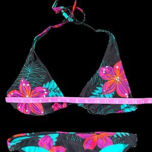 The Xhilaration Bikini features a distinctive Y2K-inspired floral design embellished with shimmering bling embroidery in pink and blue tones. Its halter neck tie straps offer adjustable support and a customizable fit, combining vintage appeal with modern comfort. Perfect for making a stylish statement by the water, this bikini blends eye-catching details with functional design.