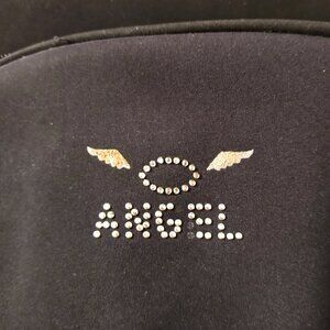 Soft satin/matte finish, dressy black fabric with silver tone metal hardware, pre-loved excellent condition - the word "Angel" under glitter wings is bedazzled in silver dots. Two dots on the "E" are missing (see images), could be replaced by a competent crafter. Other minor imperfection is interior of the pocket with "Xhilaration" label - the threads at one corner are loose like someone stabbed their finger too hard into the pocket - couldn't get a picture, it is too far inside. Easy fix with a couple stitches, or leave as is for a super secret portal to the deep interior (for some rolled up bills, or whatever...). Fabric tag has been cut off. This is a well constructed bag and is super clean inside. Cute and elegant accessory for the angel in your life! See images for dimensions.