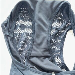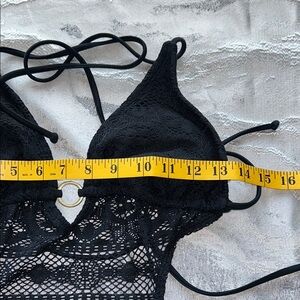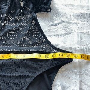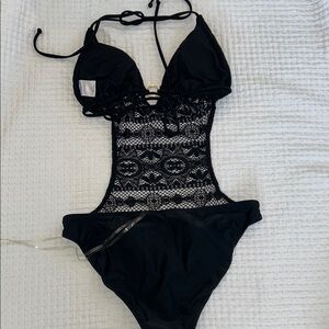 Elegant black one piece with lace detailing. Halter neck design. Perfect for beach or pool.