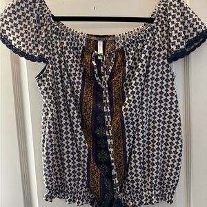 Xhilaration Blue and White Smocked Blouse with Tie Front